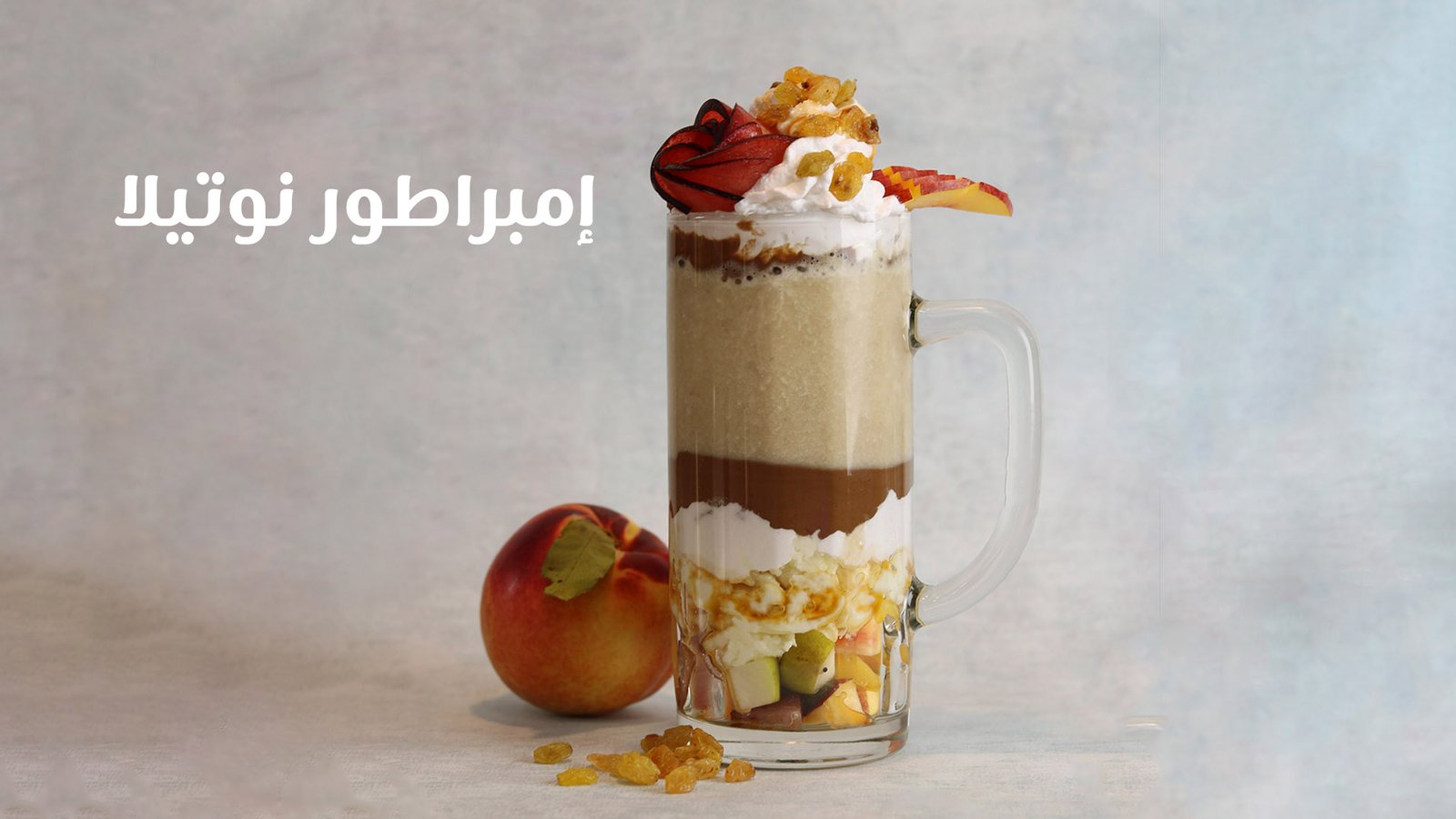 Layers of fruit pieces, cream, chocolate and cream as well as a milk, banana and mango cocktail