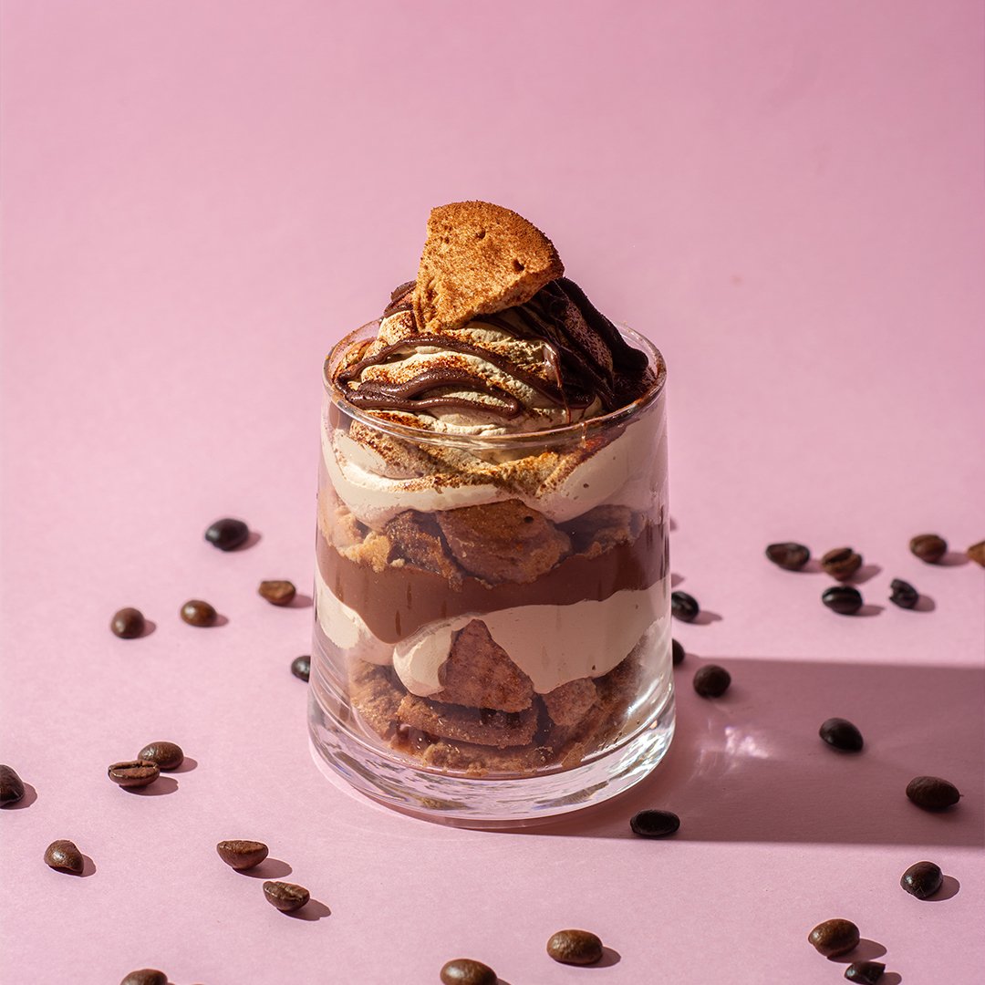A small glass filled with layers of Nescafe cream with tiramisio biscuits and chocolate